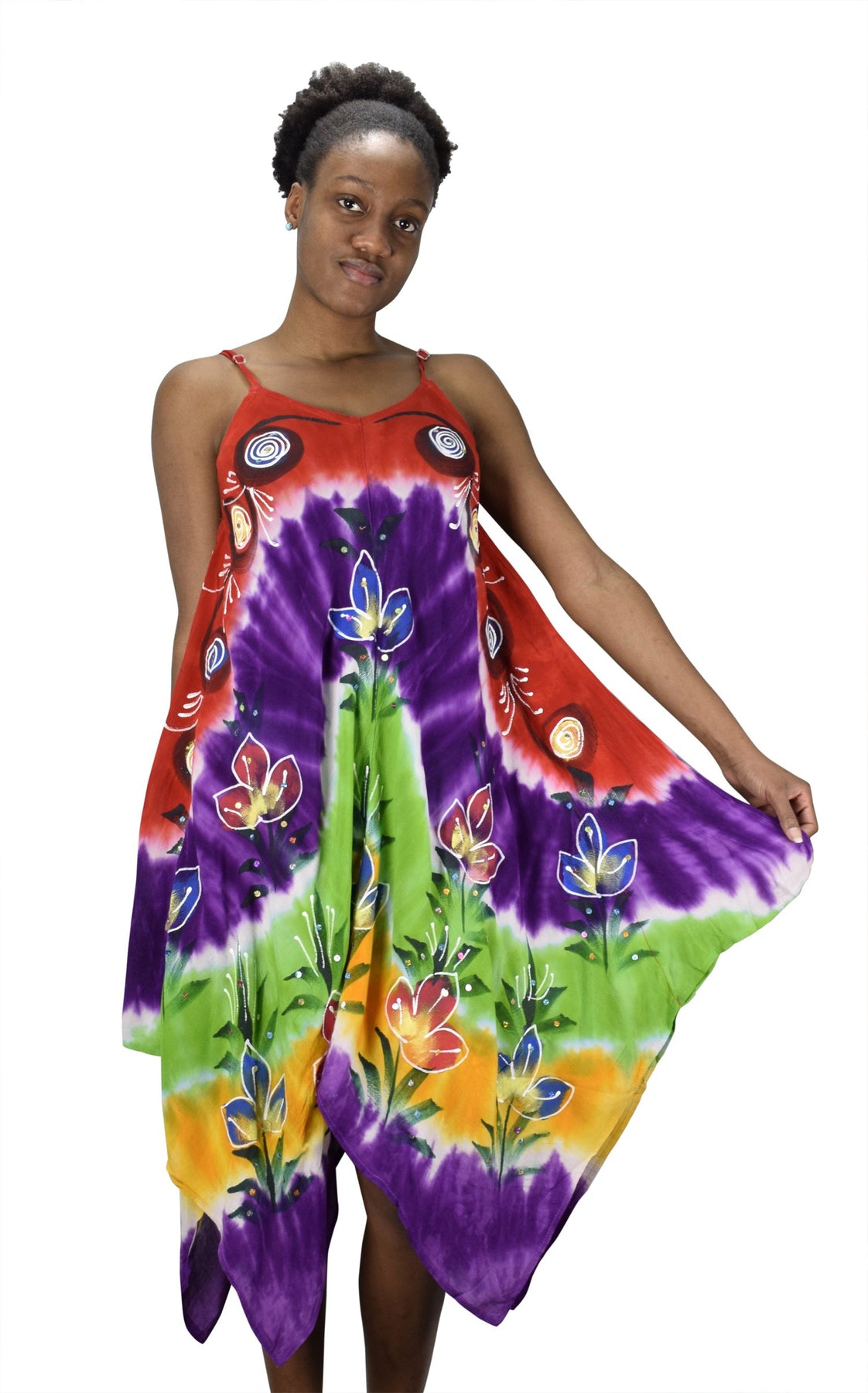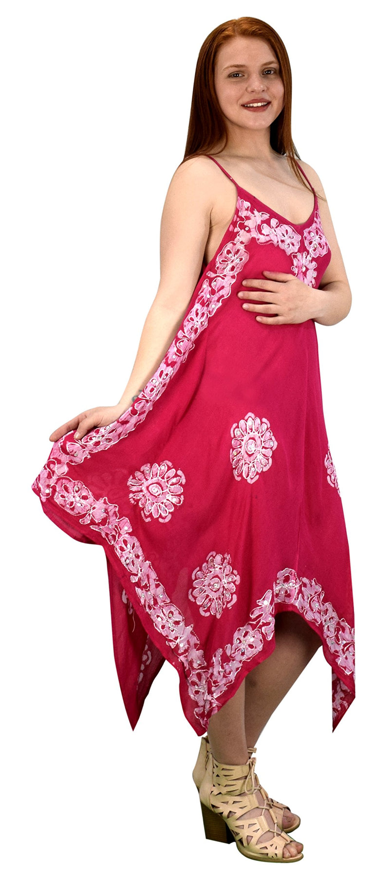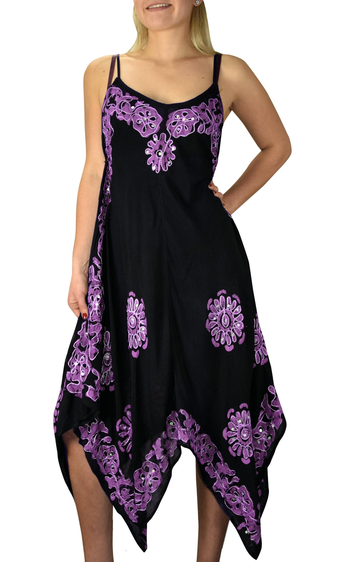 • Fun & Flirty - This maxi dress features adjustable spaghetti shoulder strap, handkerchief hem and multi color embroidered and tie dye floral border with sequins.