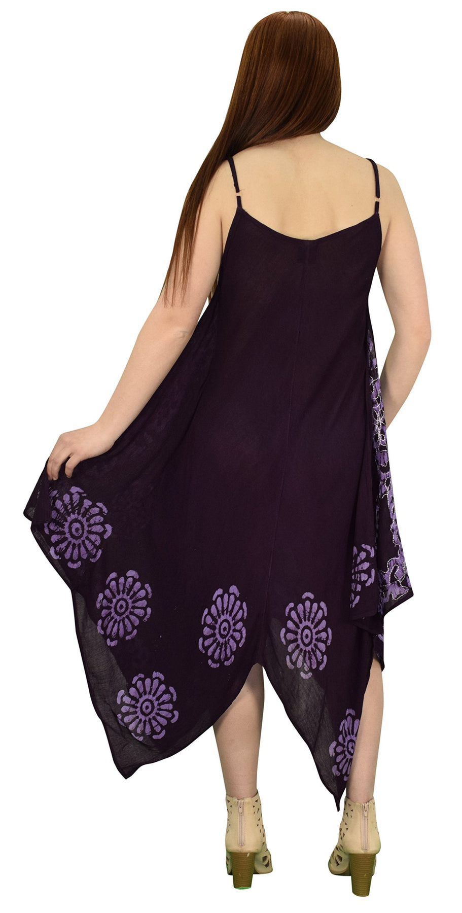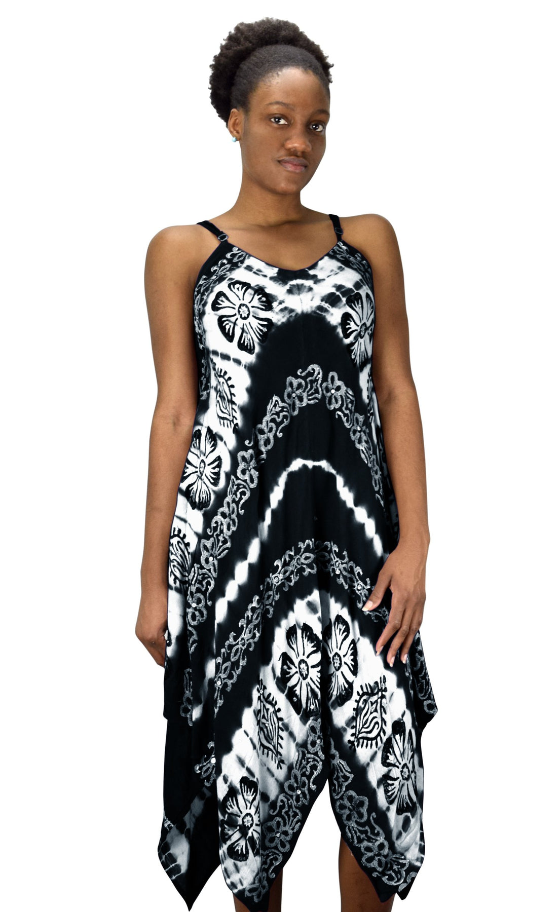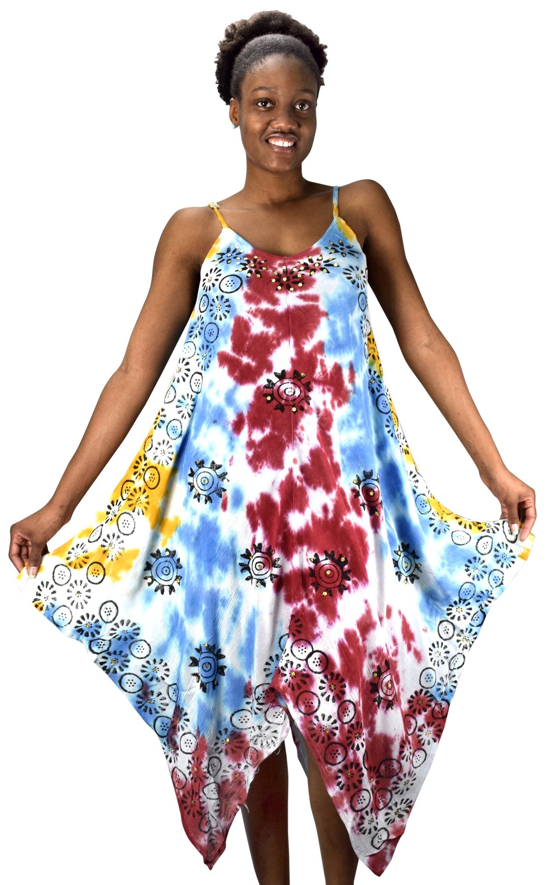 • Fun & Flirty - This maxi dress features adjustable spaghetti shoulder strap, handkerchief hem and multi color embroidered and tie dye floral border with sequins.