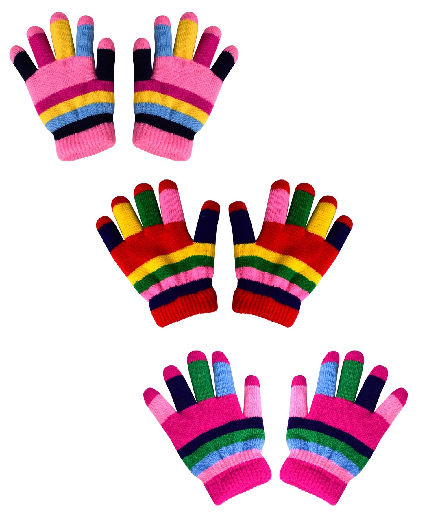 These vibrant kids' gloves come in an assorted pack of three, providing plenty of options to match any outfit. Each surprise pack offers a delightful selection of colors, including rainbow, neutral stripes, and solid hues. These warm and snug gloves are ideal for the winter ski season or everyday warmth. Fits ages 2-6 years. Made from 100% Acrylic for ultimate comfort and durability.