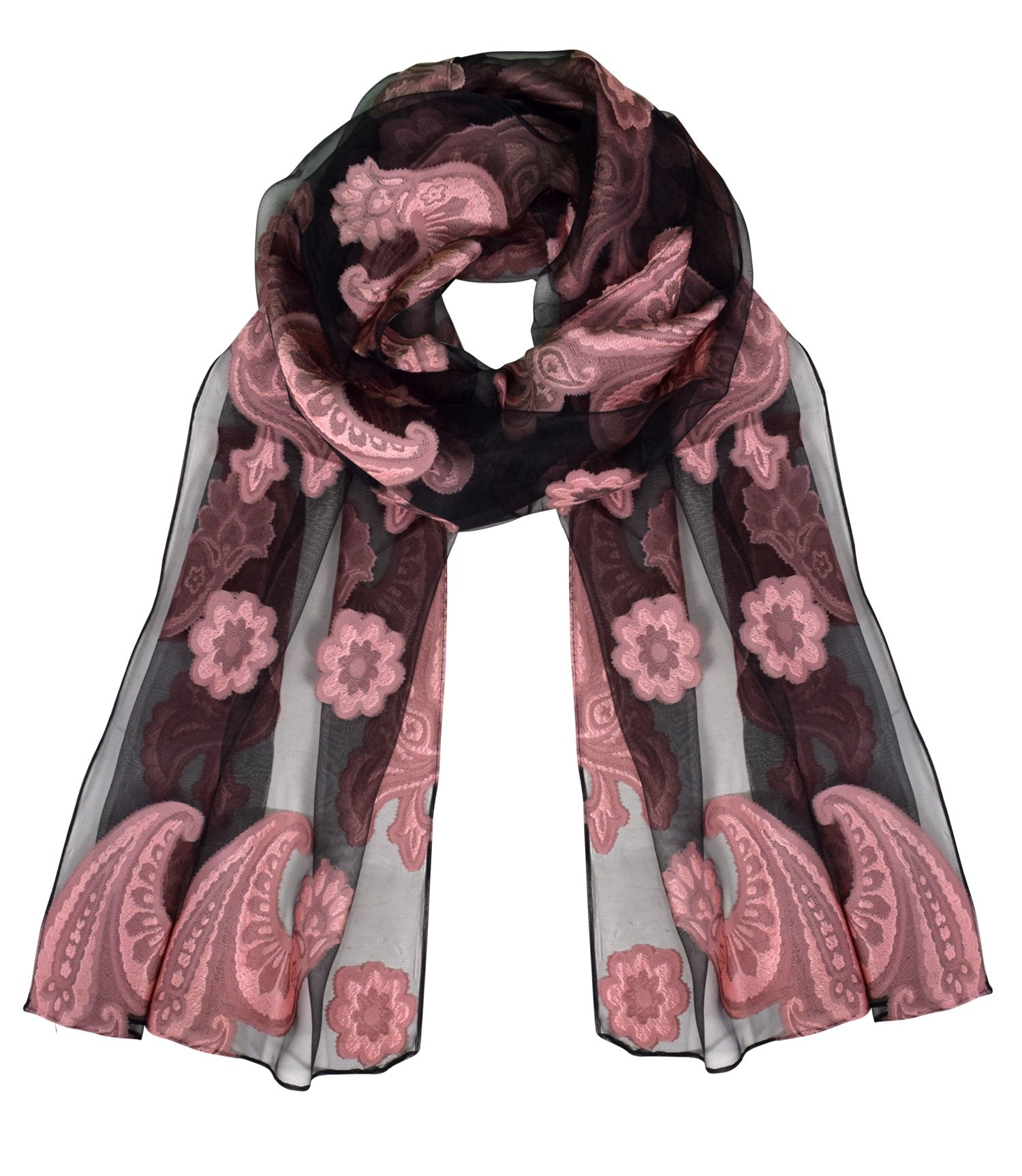 Black & Pink Sheer Embroidered Paisley Burnout Scarf