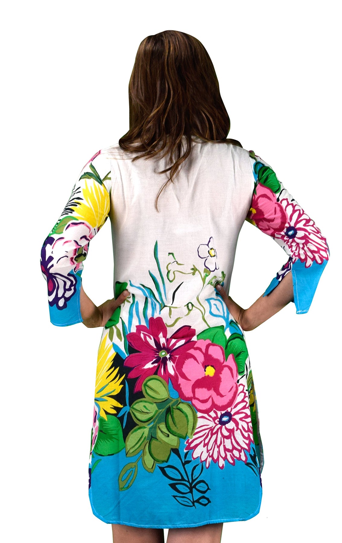 Details: These tunics boast a bold, Far East-inspired floral embroidery design, complemented by a hand-printed floral border. Designed for a relaxed fit, these versatile pieces can be worn as a tunic top or a mini dress. Ideal for layering over your swimsuit, creating a boho-chic poolside look!