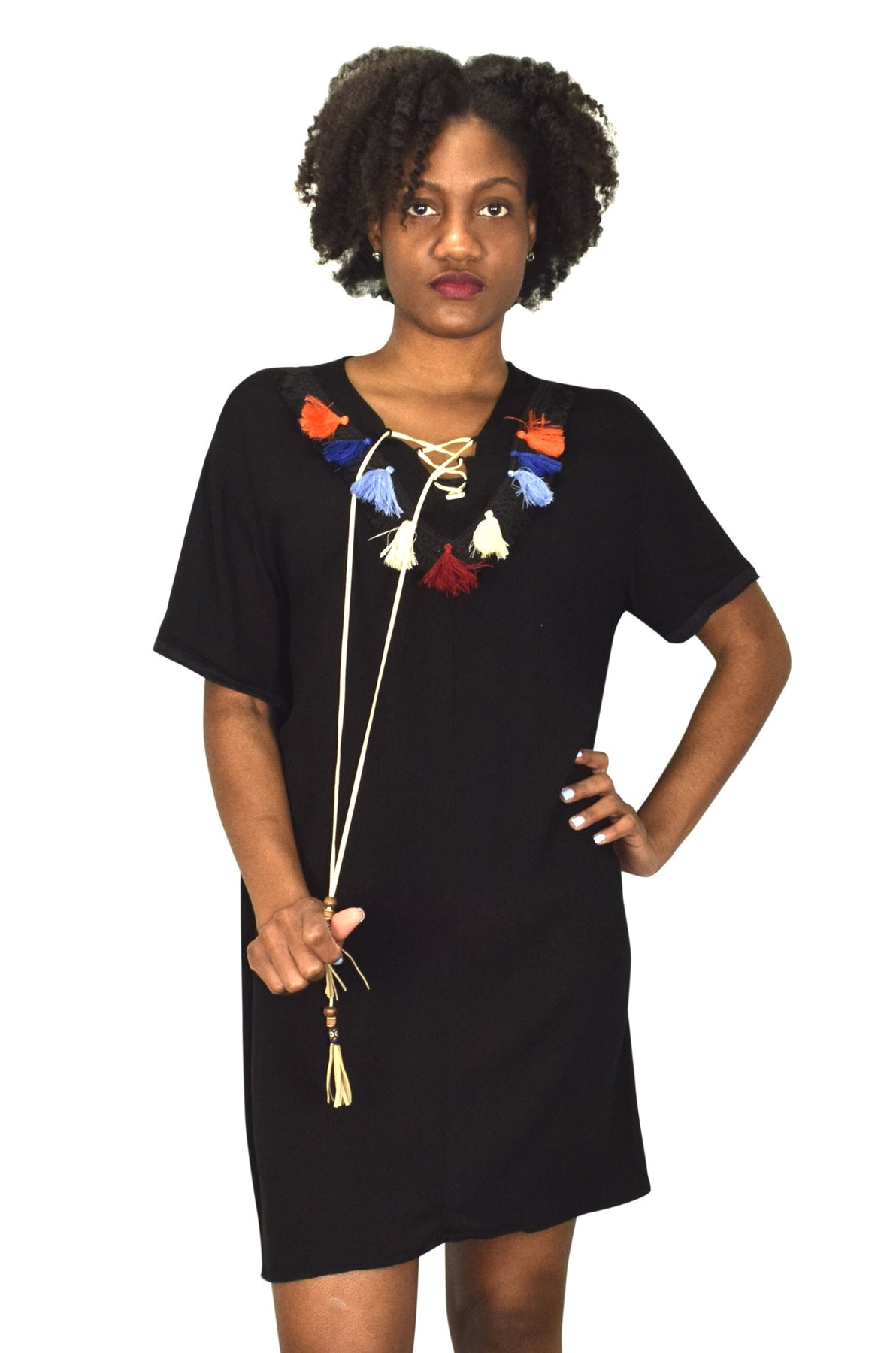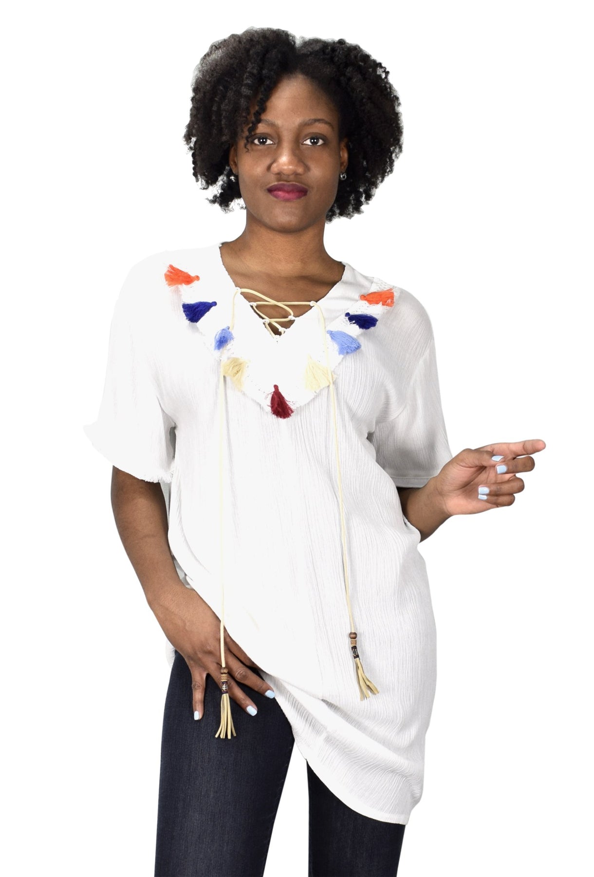 • DETAILED NECKLINE: Features a chic V-neckline with delicate laced and colorful tasseled details, completed with a stylish laced-up tie neck.
