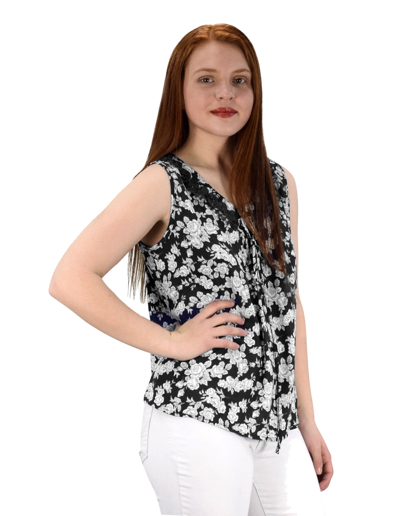Two Tone Floral Rose Print Laced Neck Line Womens Top Blouse Shirt