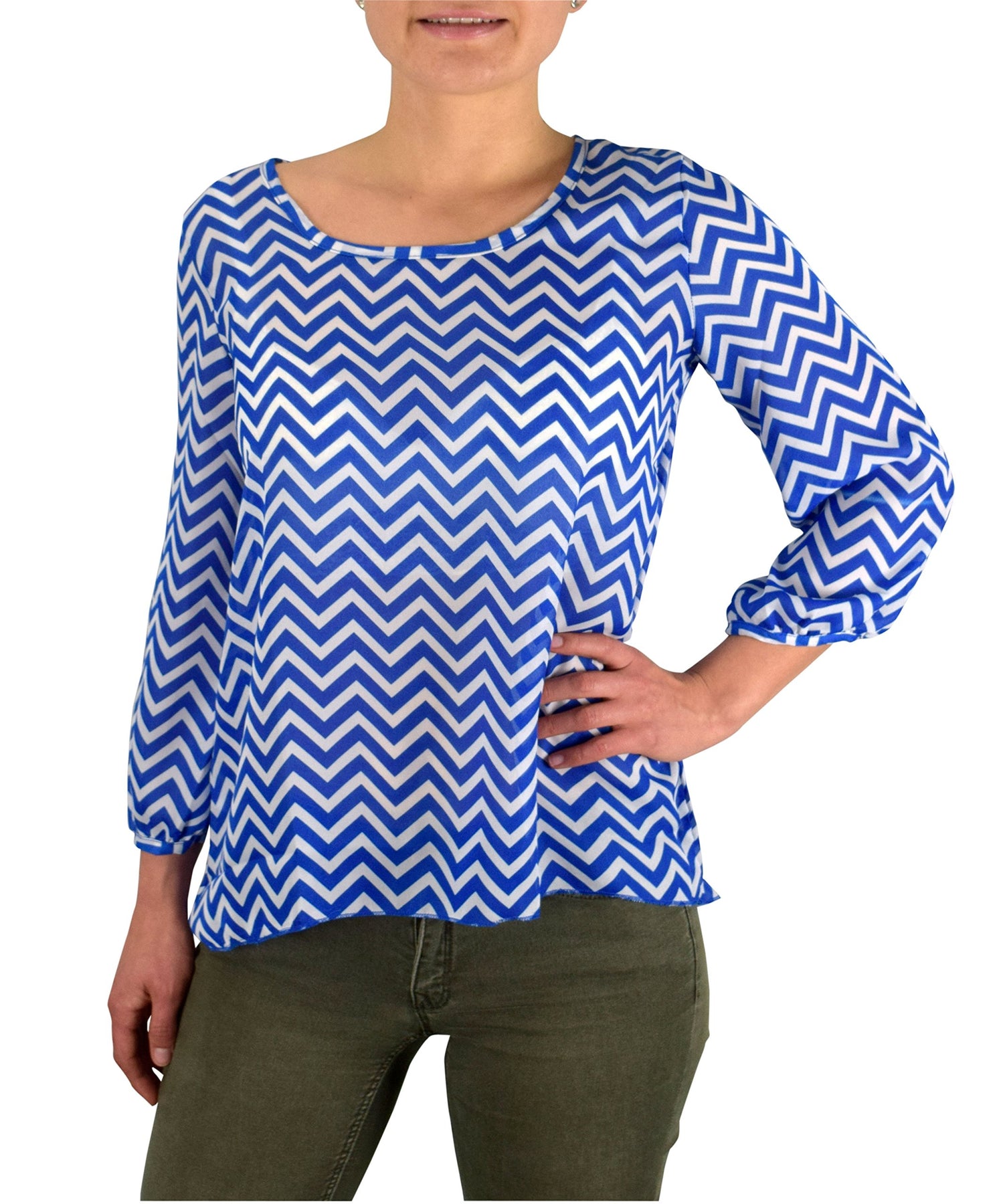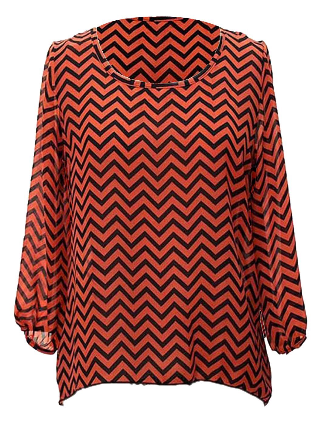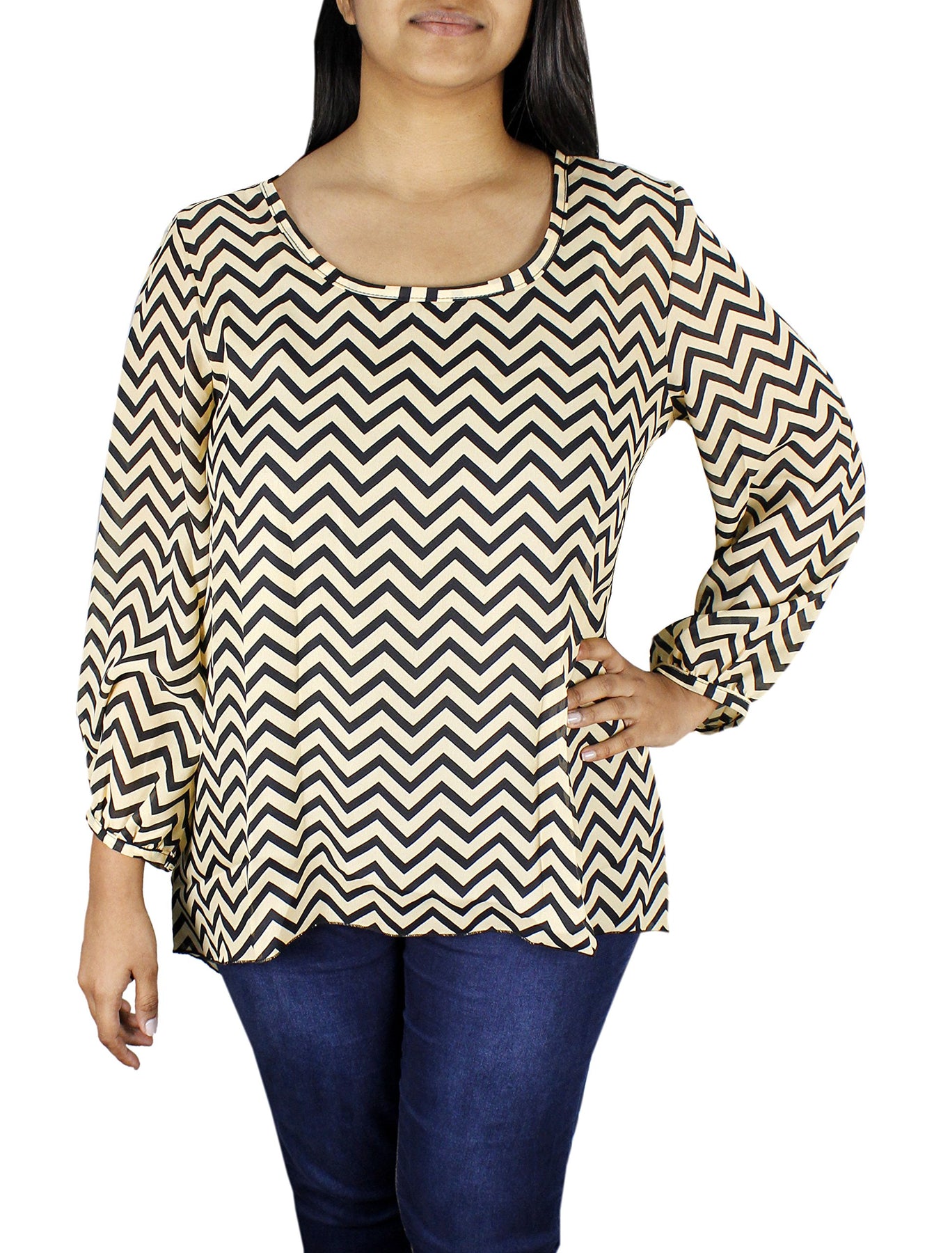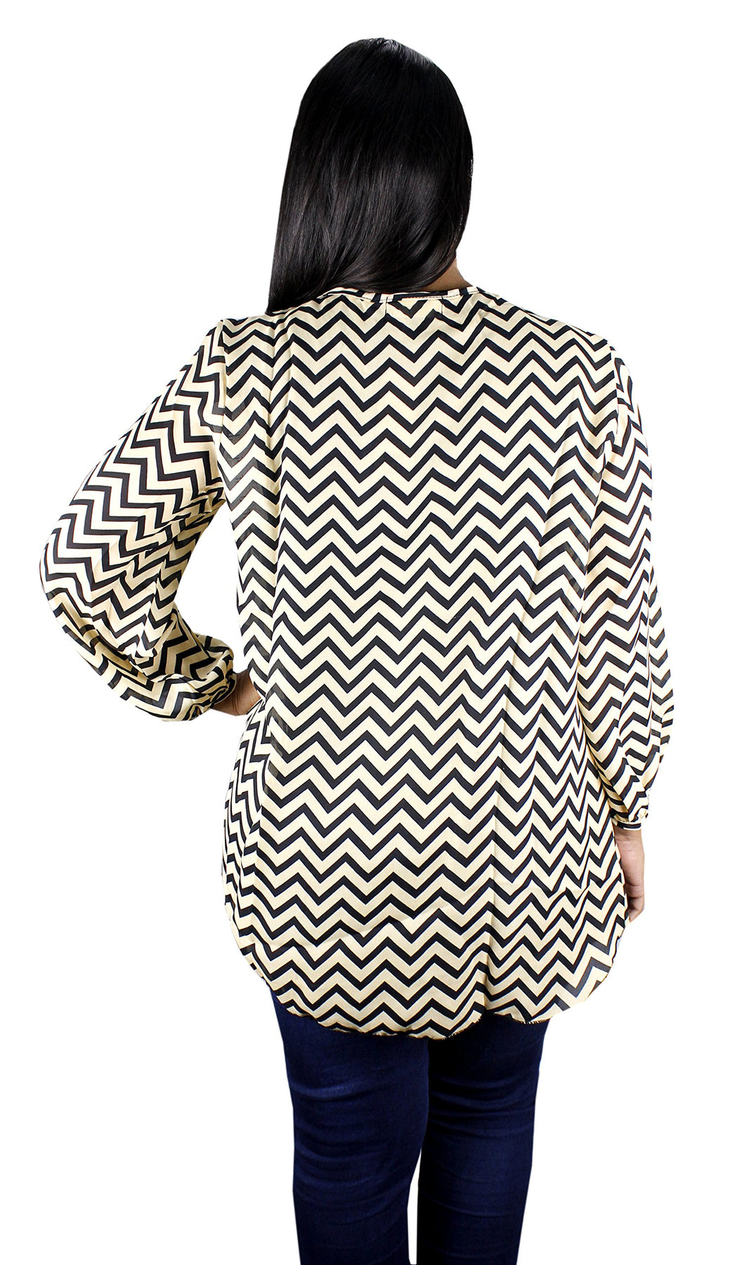 This long-sleeve, scoop-neck blouse boasts a trendy chevron print. Its loose fit ensures an airy and comfortable silhouette, making it a must-have for a fashionable wardrobe. Made from 100% polyester with a woven/crepe look and feel, this versatile top is an excellent addition to your fashion accessories collection. Perfect for gifting or everyday style.
