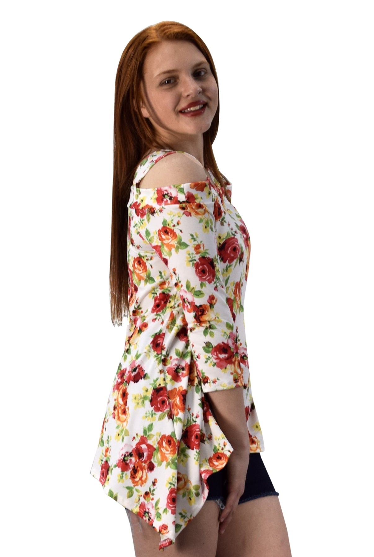Womens Cut Out Shoulder 3/4 Sleeve Loose Silhouette Top Blouse